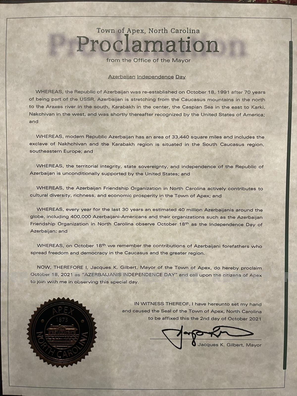ABŞ-ın Şimali Karolina ştatının Apeks şəhərinin meri Jak Jilber 18 oktyabr Azərbaycanın Müstəqillik Günü ilə əlaqədar Bəyannamə imzalayıb.
