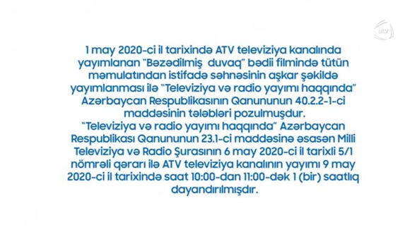 Qeyd olunub ki, 1 may 2020-ci ildə ATV televiziyasının efirində yayımlanan "Bəzədilmiş duvaq” bədii filmində tütün məmulatından istifadə səhnəsinin aşkar şəkildə yayımlanması ilə "Televiziya və radio yayımı haqqında” Qanunun 35.10-cu maddəsinin tələbləri pozulub.