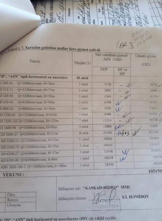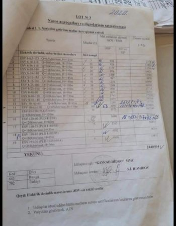 Təkcə bir lot üzrə bu şirkətdən qiyməti maksimum 2680 manat alınan 250 ədəd ESV 120-60 (PLD 8122/4) (Q=120kbm / sant, H-60m) nasoslarının hər biri 3690 manat göstərilib.