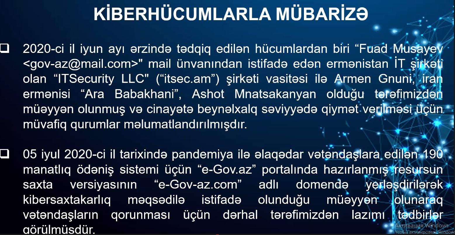 "Bizim araşdırmamız nəticəsində məlum oldu ki, bu hücumun arxasında Ermənistana məxsus "IT Security LLC” (itsec.am) şirkəti dayanır. Bu şirkət vasitəsi ilə Armen Qnuni (Armen Gnuni), İran ermənisi Ara Babaxani (Ara Babakhani), Aşot Mnatsakanyanın (Ashot Mnatsakanyan) həmin hücumu Fuad Musayev adı altında həyata keçirdiyini müəyyən etdik və cinayətə beynəlxalq səviyyədə qiymət verilməsi üçün müvafiq qurumları məlumatlandırmışıq”.