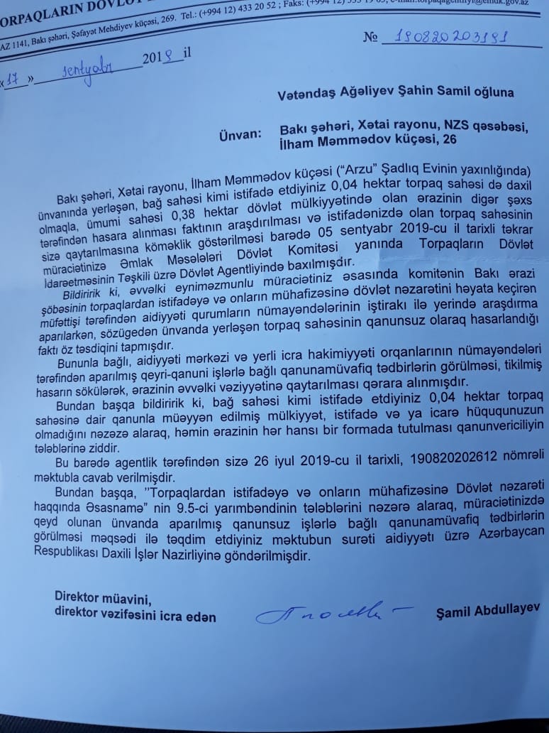 NZS qəsəbəsi, İ.Məmmədov küçəsi 26-da yaşayan vətəndaş Şahin Ağəliyev bildirir ki, sözügedən əraziyə 20 il nəzarət edib, ağac əkib, bağ salıb. Amma neft sahəsində işləməsinə baxmayaraq SOCAR Neft Kəmərləri İdarəsinin rəisi olmuş Zöhrab Quliyev ona həmin ərazidə ev tikməyə icazə verməyib.