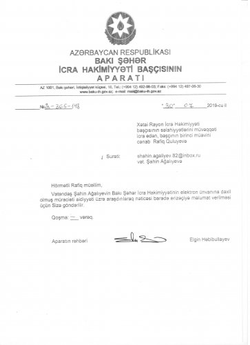 AzToday.az xəbər verir ki, Bakı şəhər İcra Hakimiyyətinin aparat rəhbəri Elgün Həbibullayev Xətai rayon İcra Hakimiyyəti başçısının birinci müavini, Xəta rayon İcra Hakimiyyəti başçısının səlahiyyətlərini icra edən Rafiq Quliyevə ünvanladığı 30 iyul 2019-cu il tarixli məktubda sözügedən ərazidə araşdırma apararaq vətəndaş Şahin Ağəliyevə məlumat verilməsi tələb olunur. Lakin, bu müddət ərzində nə Xətai rayon İcra Hakimiyyəti, nə də Bakı şəhər İcra Hakimiyyəti sözügedən ərazini əvvəlki vəziyyətinə gətirməmişlər. Səbəb nədir? Deyilənlərə görə, həmin torpaq sahəsi üçün SOCAR Neft Kəmərləri İdarəsinin müdiri olmuş Zöhrab Quliyevə bir neçə milyon manat civarında pul verilib. Daha sonra işbazlar ərazidən keçən yüksək gərginliklikli elektrik dirəklərinin götürülməsi üçün "Azərenerji” ASC rəhbərliyinin də maraqlarını təmin ediblər. Bununla yanaşı torpaq sahəsi Xətai rayon ərazisinə düşsə də burada Nizami rayon İcra Hakimiyyətinin başçısı Arif Qasımovun da bu prosesdə rolu olduğu bildirilir. Bəzi məlumatlara görə ərazini bir generala məhz Arif Qasımov məsləhət bilib və alqı-satqını keçmiş tanışı, həmyerlisi Zöhrab Quliyevin vasitəsilə reallaşdırıblar Hazırda ərazinin sənədləşdirilməsi üzərində iş gedir. Burada Xətai rayon Əhmədli qəsəbə Bələdiyyəsinin də adı hallanır. Əhmədli qəsəbə bələdiyyəsi Neft Emalı Zavodunun ərazisini hərraca çıxara bilərmi? Təbii ki, yox. İcra Hakimiyyətinə verilən haqqı da buraya əlavə etsək əraziyə külli miqdarda pul tökülmüş olduğunu görərik. Bu qədər xərc çəkılən yeri kim əvvəlki vəziyyətinə qaytarar? Heç kim. Odur ki növbədə Bakı şəhər İcra Hakimiyyəti durur ki, o da öz haqqını alsın və tikintiyə razılıq versin…