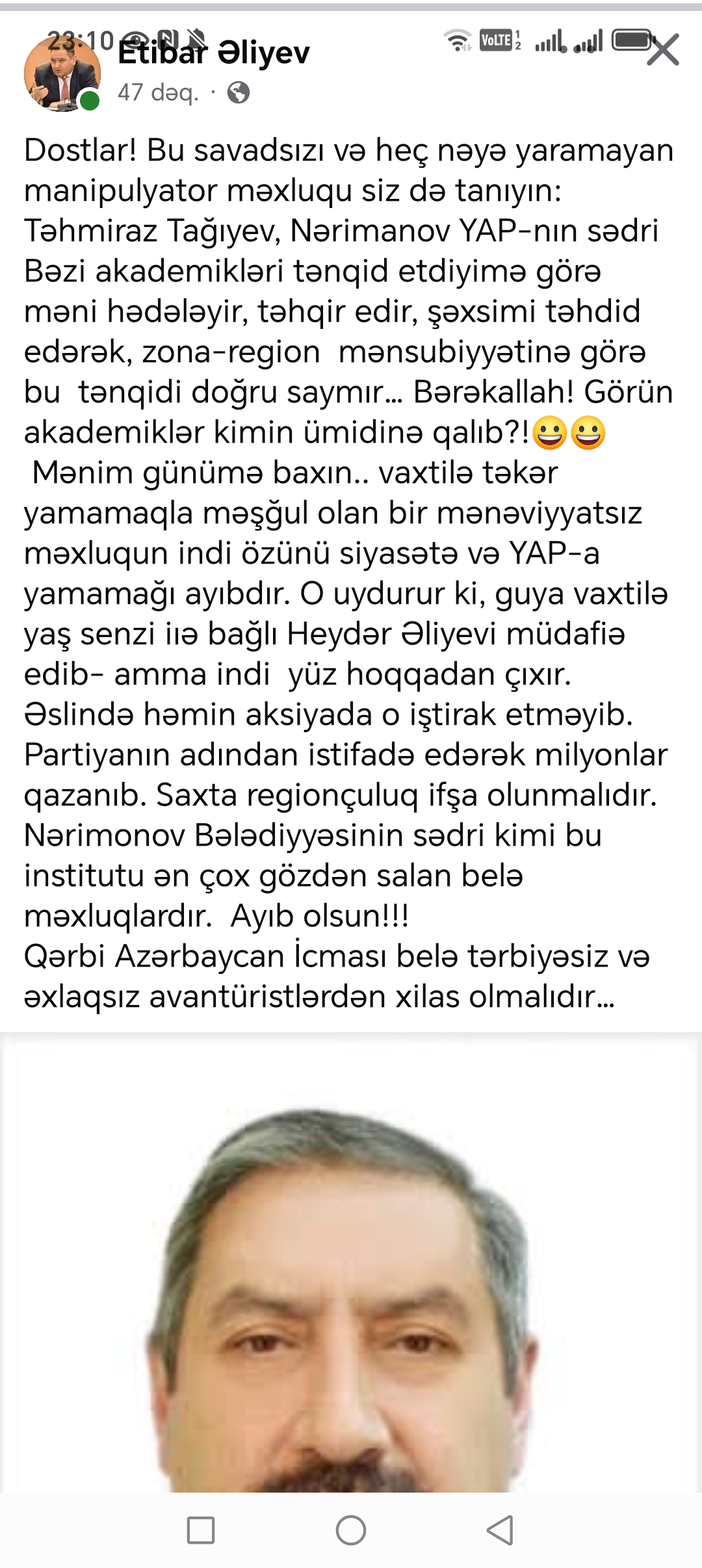 "Dostlar! Bu savadsızı və heç nəyə yaramayan manipulyator məxluqu siz də tanıyın: Təhmiraz Tağıyev, Nərimanov Bələdiyyəsinin əbədi sədri.