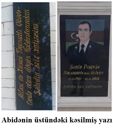 Xanımın sözlərinə görə, şəhid ailəsinə vurulan növbəti zərbə şəhid Pərvin Əliyevin xatirəsini əbədiləşdirmək üçün ailə tərəfindən qoyulan abidə ilə bağlı olub. Pərvinin döyüş yoldaşlarının və ailənin vəsaiti hesabına ərsəyə gətirilən abidənin üzünün yazısını icra hakimiyyəti doğratdırıb. "Biz abidənin üstünə "Ailəsi və Xüsusi Təyinatlı Qüvvələrdə olan döyüş Yoldaşlarından Şəhidin əziz xatirəsinə” yazdırmışdıq. Biləsuvar Rayon İcra Hakimiyyəti həmin yazı olan lövhəni kəsib "Şəhidin əziz xatirəsinə” olan hissəsini saxlamışdı. Kəsilən hissəsini zibilliyə atmışdılar. Həmin kəsilən hissəni zibillikdən tapıb gətirib evdə saxlayıram” – deyə xanım vurğulayır.