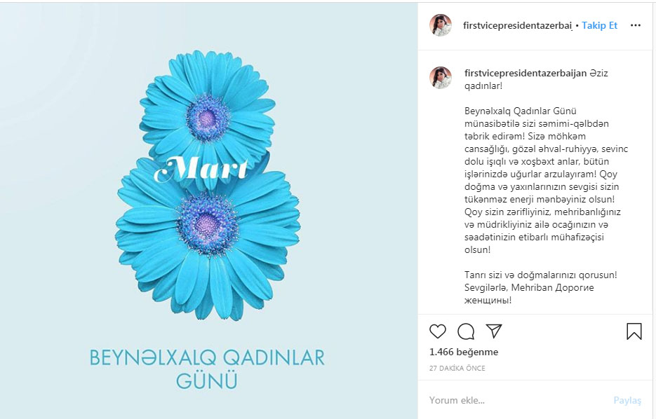 Azərbaycan Respublikasının Birinci vitse-prezidenti Mehriban Əliyeva rəsmi "Instagram" səhifəsində etdiyi paylaşımda qadınları təbrik edib.
