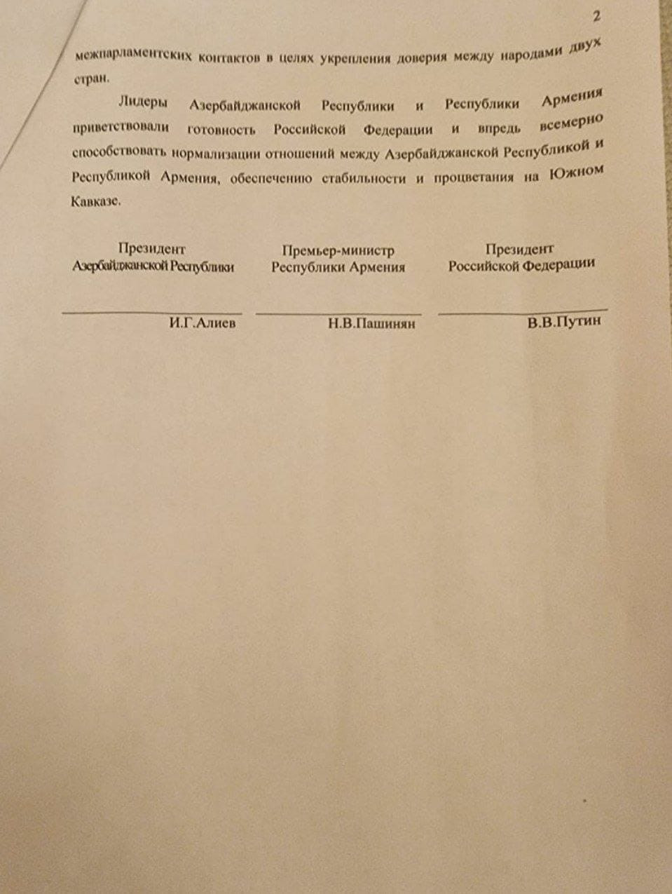 Azərbaycan-Ermənistan münasibətlərinin hərtərəfli normallaşması, Cənubi Qafqazda sülhün, sabitliyin, təhlükəsizliyin və davamlı iqtisadi inkişafın təmin edilməsi naminə bütün bu sazişlərə ciddi əməl etməyə bir daha sadiqlik nümayiş etdirilib. Biz humanitar məsələlər də daxil olmaqla, qalan vəzifələrin təcili həllinə yönəlmiş əlavə səylər göstərməyə razılaşdıq".