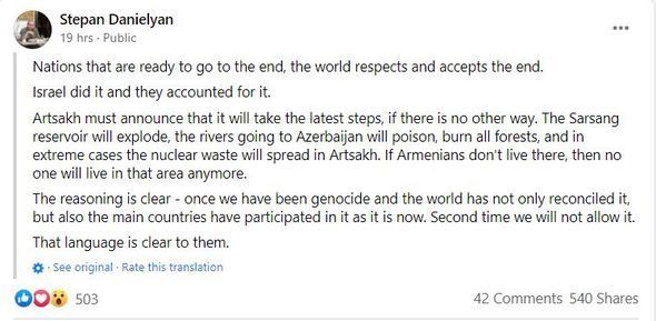 S. Danielyan sosial şəbəkə hesabında yazıb ki, dünyada sona qədər getməyə hazır olan xalqların ultimatumu qəbul edilir və ona hörmət olunur: "İsrail bunu etdi və o, nəzərə alındı. Sərsəng su anbarını partlatmaq, Azərbaycana axan çayları zəhərləmək, bütün meşələri yandırmaq lazımdır”.