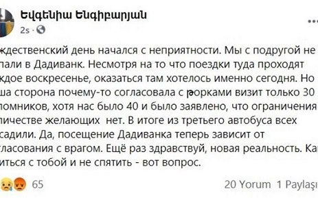 "Milad günü xoşagəlməz hadisə ilə başladı. Rəfiqəm ilə Xudavəngə gedə bilmədik. Ora səfərlərin hər bazar olmasına baxmayaraq, məhz bu gün orada olmaq istədik. Bizim 40 nəfər olmağımıza baxmayaraq, həmçinin ziyarət etmək istəyənlərin sayında məhdudiyyətin olmaması bildirilsə də, bizim tərəf (Ermənistan tərəfi – "Report”) yalnız 30 ziyarətçini türklərlə (Azərbaycan tərəfi – "Report”) razılaşdırıb. Nəticədə üçüncü avtobusdan hamını düşürdüblər. Hə, Xudavəngi ziyarət etmək düşmənlə razılaşdırmadan asılıdır. Salam, yeni reallıq. Səninlə necə barışıb və dəli olmamaq – məsələ budur”, – o qeyd edib.