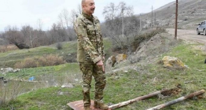 Ermənilərin qurduğu yol nişanı Əliyevin ayağı altında (FOTO)