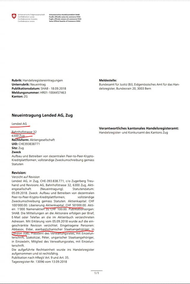 O bildirib ki, keçmiş nazir Əli Abbasovun oğlu Eldar Abbasovun İsveçrədəki şirkəti – LENDED AG 50 000 frank nizamnamə kapitalı ilə 2018-ci il sentyabrın 13-də qeydiyyatdan keçib. Şirkət (qeydiyyat nömrəsi CH-170.3.042.824-2) informasiya texnologiyaları sahəsində fəaliyyət göstərir, İsveçrənin Zug şəhəri, Bahnhofstraße 32 ünvanında hüquqi qeydiyyatdadır.