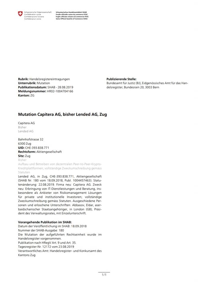 Onun sözlərinə görə, 2019-cu ildə şirkətin nizamnamə kapitalı iki dəfə artılaraq 100 min franka (təxminən 200 min manat) çatdırılıb və CAPİTERA AG adı ilə yenidən qeydiyyatdan keçib. Səhmdar Cəmiyyətdə keçmiş nazirin oğlunun ortağı Peter Szakolczai adlı Macarıstan vətəndaşıdır.