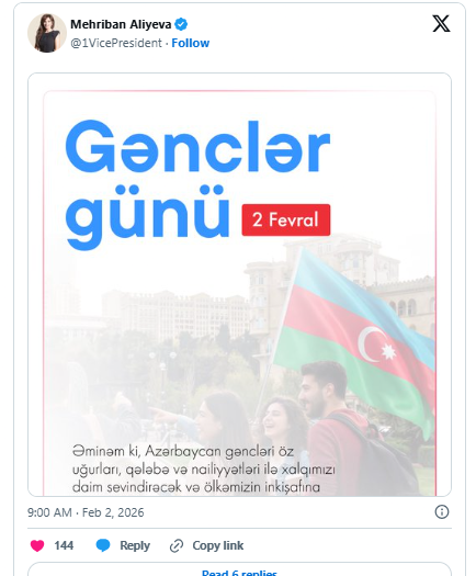 Azərbaycanın Birinci vitse-prezidenti Mehriban Əliyeva sosial media hesablarında 2 Fevral - Azərbaycan Gəncləri Günü ilə bağlı paylaşım edib.