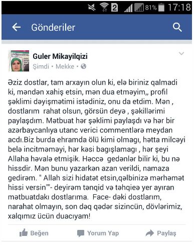 G.Əhmədova yazdığı son statusla bu məsələyə öz reaksiyasını belə bildirib: "Əziz dostlar, tam arxayın olun ki, elə biriniz qalmadı ki, məndən xahiş etsin, mən dua etməyim. Profil şəklimi dəyişməyimi istədiniz, onu da etdim. Mən, dostlarım rahat olsun, görsün deyə, şəkillərimi paylaşdım. Mətbuat hər şəklimi paylaşdı və hər bir azərbaycanlıya utancverici commentlərə meydan açdı. Biz burda ehramda ölü kimi olmağı, hətta milçəyi belə incitməməyi, hər kəsi bağışlamağı, hər şeyi Allaha həvalə etmişik. Həccə gedənlər bilir ki, bu nə hissdir. Mən bunu yazarkən azan verildi, namaza gedirəm. "Allah sizi hidayət etsin, qəlbinizə mərhəmət hissi versin" - deyirəm tənqid və təhqirə yer ayıran mətbuatdakı dostlarıma... Facebookdakı dostlarım, narahat olmayın, son dəqiqəyə qədər sizincün, dövlərimiz, xalqımız ücün duaçıyam”.