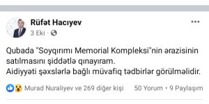 Bir müddət bundan əvvəl Quba Soyqırımı Memorial Kompleksi ərazisində qanunsuz tikinti işlərinin başlamasına etiraz edən Quba-Xaçmaz Regional təhsil idarəsinin müdiri Rüfət Haciyev öz facebook hesabında "Quba Soyqırımı Memorial Kompleksi ərazisinin satılmasını şiddətlə qınayıram.Aidiyyatı şəxslərlə bağlı müvafiq tədbirlər görülməlidir” sözlərini yazmışdı. İdarə müdirinin bu statusu Quba RİH-nin başçısı Ziyəddin Əliyevi bərk qəzəbləndirib və demək olarki rayonda keçirilən bir çox tədbirdə Rüfət Haciyevi sərt tənqid etməyə başlayıb. Sonuncu dəfə ötən həftə keçirilən rayon tədbirində isə Ziyəddin Əliyev Quba-Xaçmaz Regional təhsil idarəsinin müdiri Rüfət Haciyev haqqında daha kəskin danışıb və onun ünvanına doğru qeyri-etik ifadələr işlədib.