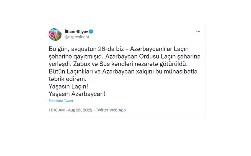 Dövlət başıçısı yazıb: "Bu gün, avqustun 26-da biz – Azərbaycanlılar Laçın şəhərinə qayıtmışıq. Azərbaycan ordusu Laçın şəhərinə yerləşdi. Zabux və Sus kəndləri nəzarətə götürüldü. Bütün Laçınlıları və Azərbaycan xalqını bu münasibətlə təbrik edirəm. Yaşasın Laçın! Yaşasın Azərbaycan!”.