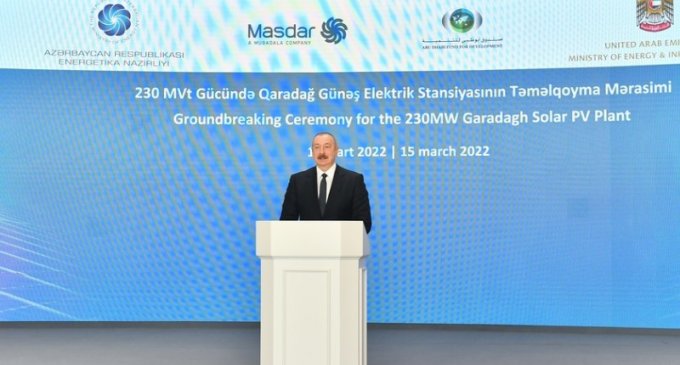 Birləşmiş Ərəb Əmirliklərinin "Masdar” şirkəti tərəfindən Azərbaycanda inşa ediləcək 230 MVt gücündə Qaradağ Günəş Elektrik Stansiyasının martın 15-də Gülüstan sarayında təməlqoyma mərasimi keçirilib.