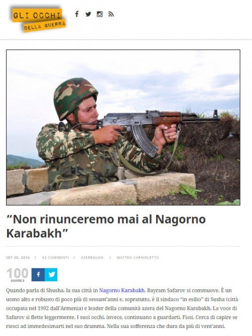 İtaliyanın nüfuzlu "Il Giornale” qəzetinin xüsusi buraxılışı olan "Gli Occhi della Guerra”da jurnalist Matteo Karnielettonun Dağlıq Qarabağın Azərbaycanlı İcması İctimai Birliyinin sədri, Şuşa Rayon İcra Hakimiyyətinin başçısı Bayram Səfərovdan aldığı müsahibə əsasında hazırladığı "Dağlıq Qarabağdan heç vaxt imtina etməyəcəyik” adlı məqaləsi dərc olunub.