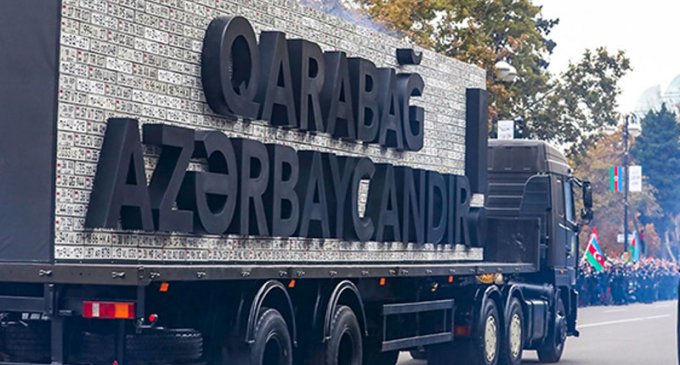 Xəbər verdiyimiz kimi, Zəfər paradında Vətən müharibəsi zamanı Azərbaycan Silahlı Qüvvələrinin işğaldan azad olunan ərazilərdə ermənilərdən qənimət götürdüyü avtomobillərin nömrə nişanlarından hazırlanmış instalyasiya nümayiş olunub.