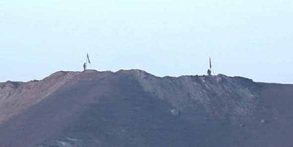 Şəkildə dalğalanan Azərbaycan bayrağından təxminən, 20-30 metr məsafədə Ermənistan bayrağı görünür.
