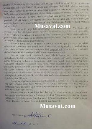 Sual vermək istəyirəm ki, xərçəng xəstəliyindən əziyyət çəkdiyim halda sonuncu dəfə nə vaxt həkim ankoloq tərəfindən müayinə olunmuşam? Cavabını özüm verərək bildirirəm ki, həbs olunandan sonra cəmi bir dəfə 2016-cı ilin may ayında səhhətimlə bağlı ekspertiza keçirilən zaman həkim ankoloq tərəfindən müayinə olunmuşam. Həmin müayinədən sonra keçən dörd ay ərzində bir dəfə də olsun həkim ankoloq tərəfindən müayinə olunmamışam. Halbuki Səhiyyə Nazirliyinin Məhkəmə-Tibbi Ekspertizası və Potoloji Anotomiya Birliyinin 102/KEŞ saylı 13 may 2016-cı il tarilxi ekspert rəyində mənim xərçəng xəstəliyindən əziyyət çəkdiyim açıq aydın şəkildə göstərilib”.