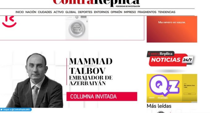 Meksikanın nüfuzlu KİV-lərindən olan "ContraReplica” qəzetlində Azərbaycan səfiri Məmməd Talıbovun Ermənistanın keçmiş münaqişə ərzində törətdiyi müharibə cinayətləri, hazırda Cənubi Qafqazda gərginliyin artmasına səbəb olan təxribatçı addımları, regionun yeni reallıqları, burada Azərbaycan tərəfindən görülən işlər və bölgədə davamlı sülhün əsas şərtləri barədə məqaləsi dərc olunub.