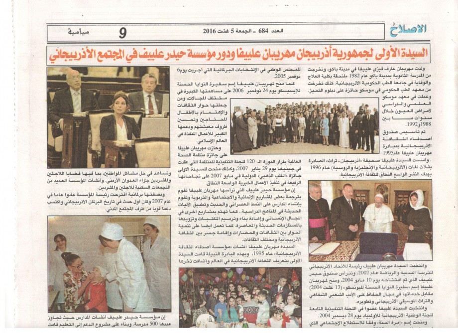 Mərakeşin ərəbdilli "əl-İslah və ət-Tənmiyə” qəzetinin 5 avqust tarixli nömrəsində "Azərbaycanın birinci xanımı Mehriban Əliyeva və Heydər Əliyev Fondunun Azərbaycan cəmiyyətindəki rolu” sərlövhəli məqalə dərc olunub.