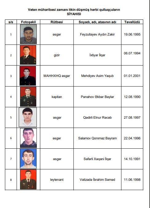 İyunun 30-dək itkin düşmüş hesab olunan 8 nəfərin foto şəkilləri, adları, soyadları, hərbi rütbəsi və doğum tarixi haqqında məlumat təqdim olunub.