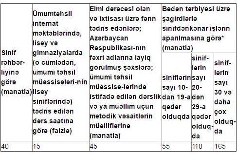Dövlət ümumi təhsil müəssisələrində çalışan bilik və bacarıqlarının diaqnostik qiymətləndirilməsi aparılan, gənclərin çağırışaqədərki hazırlığı rəhbərlərinin aylıq vəzifə maaşlarının sxemi: