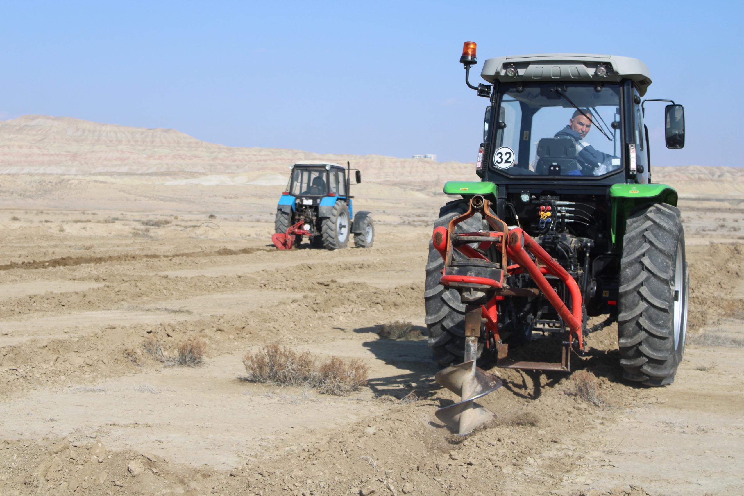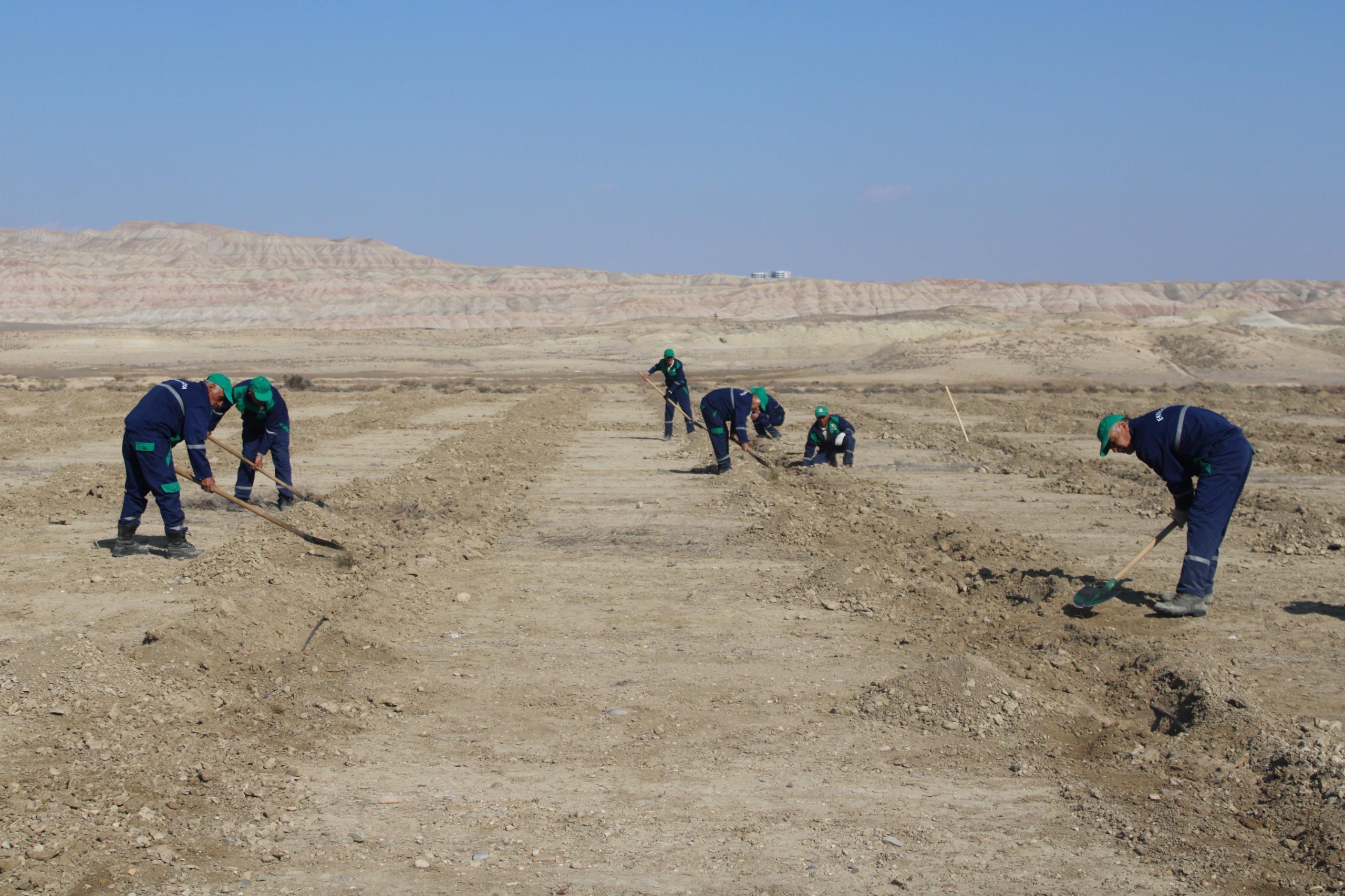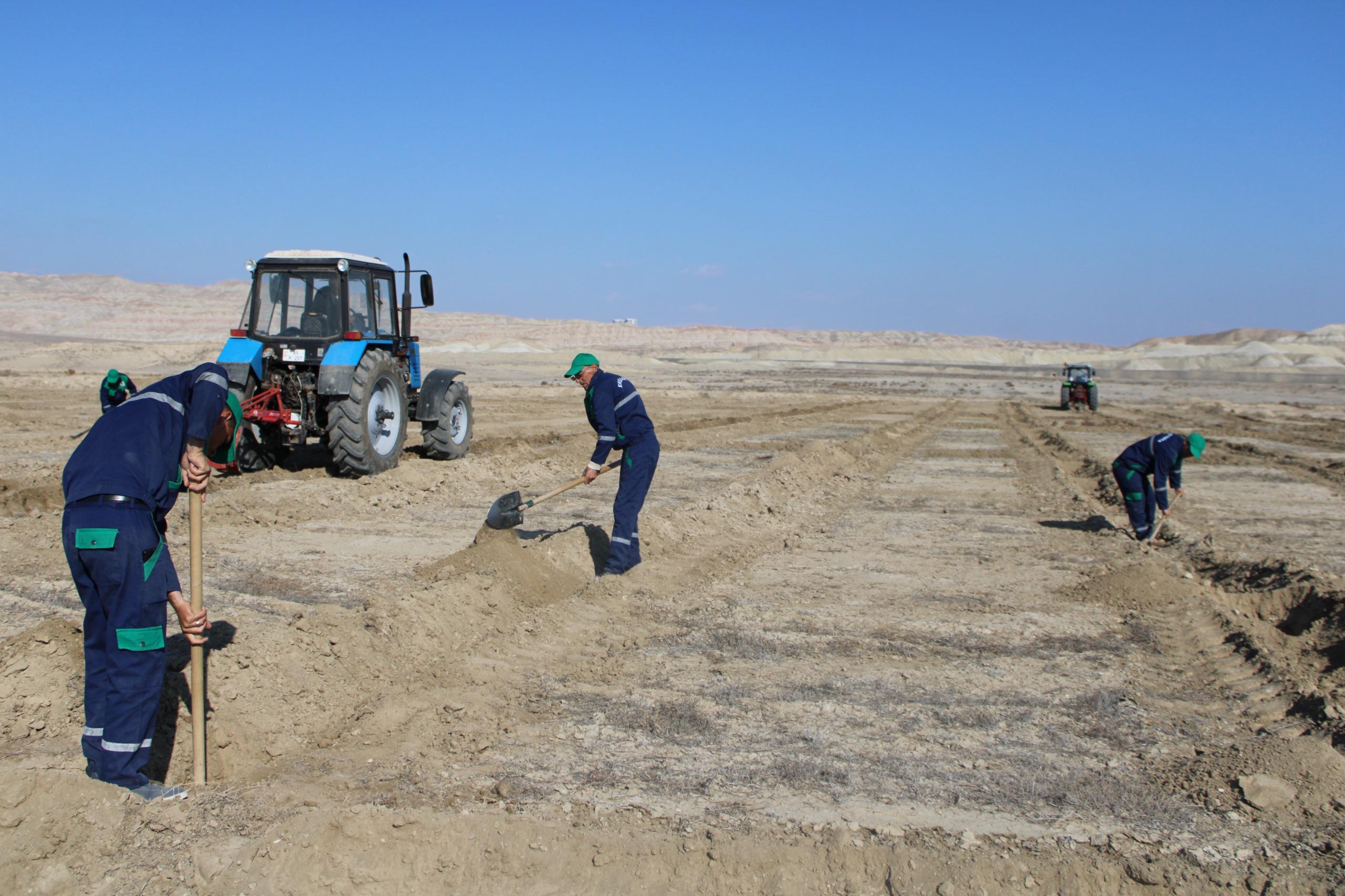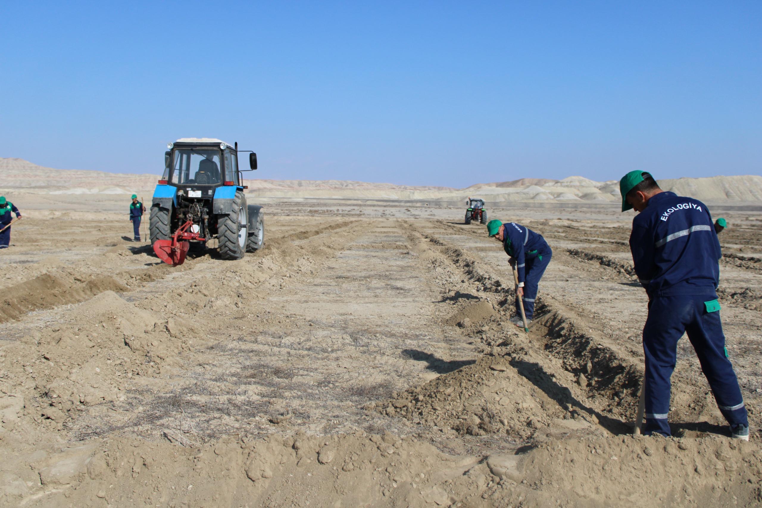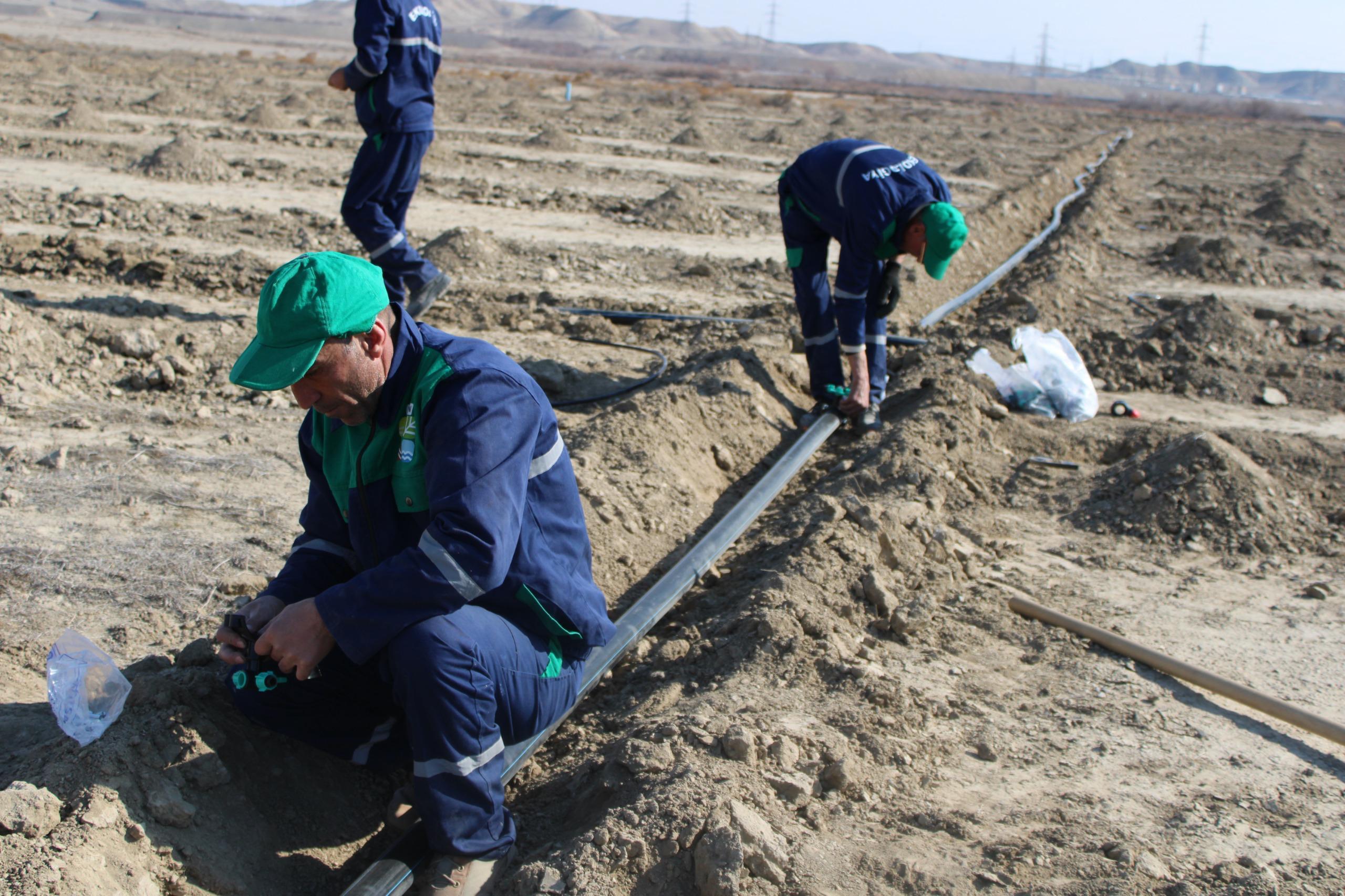 4*4 m əkin sxemi (cərgə və cərgələrarası məsafə 4 metr) ilə salınacaq yeni tut bağında xüsusi texnikaların köməyilə çalalar qazılıb, arxlar çəkilib, damcılı suvarma sistemi quraşdırılıb və digər zəruri işlər icra olunub.