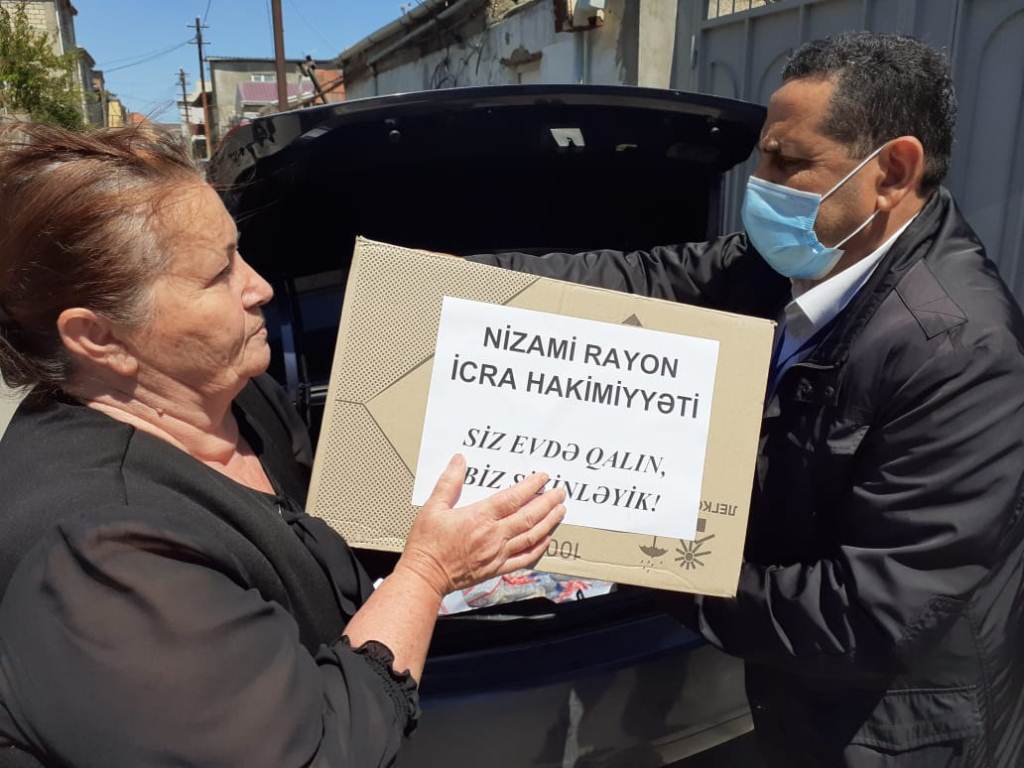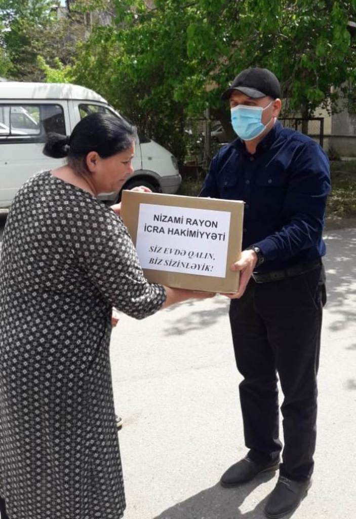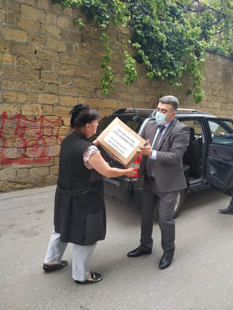Nizami Rayon İcra Hakimiyyətinin əməkdaşları tərəfindən növbəti dəfə 11-13 may 2020-ci il tarixlərində tənha yaşlılar, imtiyazlı və aztəminatlı ailələr olmaqla 210 ailəyə vacib olan gündəlik tələbat məhsullarından ibarət ərzaq sovqatları çatdırılıb.