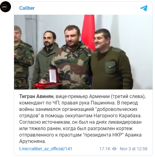 Ermənistanın Baş nazirinin müavini, Fövqəladə Hallar üzrə Komandan, Paşinyanın "sağ əli” Tiqran Avinyan (fotoda sağdan üçüncü) bir gün əvvəl məhv edilib, yaxud da ağır yaralanıb.