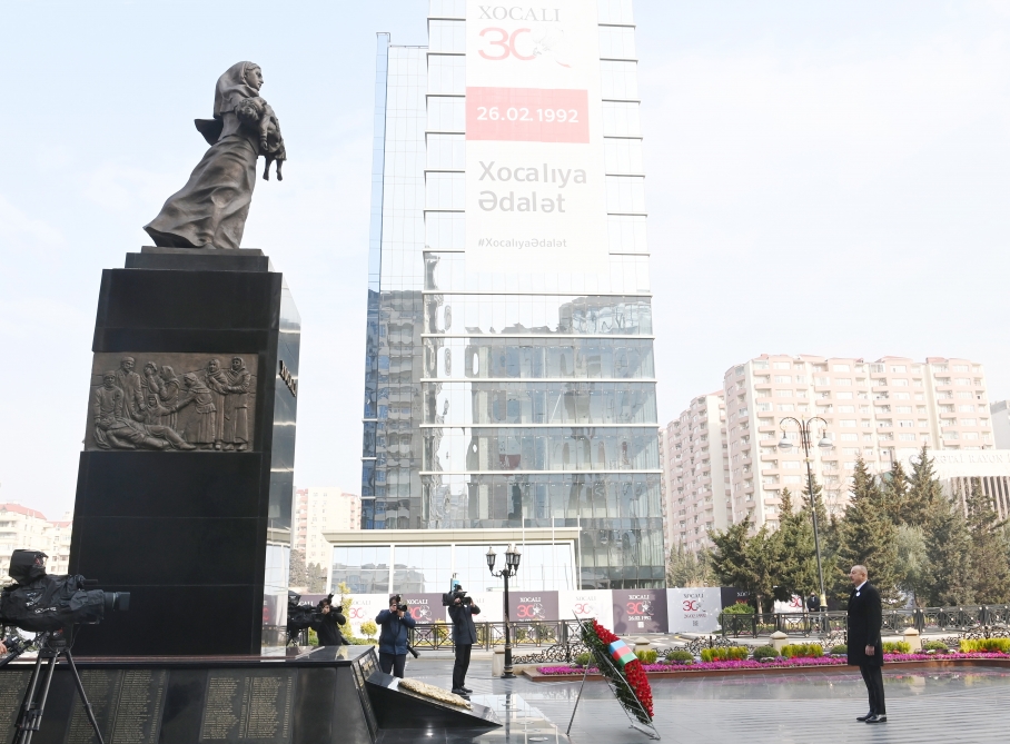Prezident İlham Əliyev Xocalı soyqırımı abidəsinin önünə əklil qoydu, faciə qurbanlarının xatirəsini ehtiramla yad etdi.