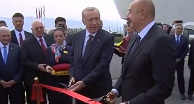 Azərbaycan və Türkiyə prezidentləri hava limanının rəmzi açılışını bildirən lenti kəsiblər.