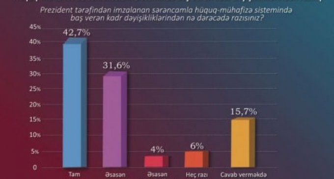 Azərbaycan Sosial Tədqiqatlar Mərkəzinin (STM) keçirdiyi ictimai rəy sorğusunda iştirak edən vətəndaşların əksəriyyəti Prezident İlham Əliyevin imzaladığı sərəncamla hüquq-mühafizə sistemində baş verən dəyişikliklərdən razılıqlarını ifadə ediblər.