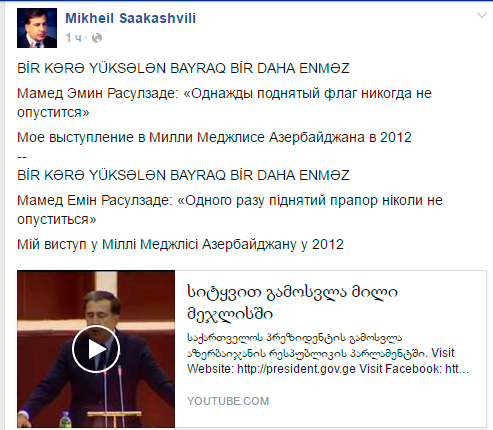 Musavat.com-un məlumatına görə, o, Facebook-da Məhəmməd Əmin Rəsulzadənin "Bir kərə yüksələn bayraq bir daha enməz” ifadəsini Azırbaycan, rus və Ukrayna dillərində yazıb. Mixail Saakaşvili Azərbaycan parlamentindəki 2012-ci ilin martındakı çıxışının videosunu da paylaşıb.