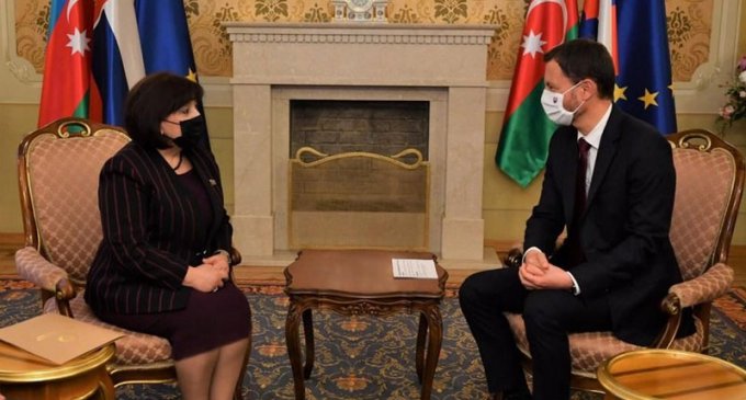 Görüşün sonunda Milli Məclisin sədri Sahibə Qafarova Baş nazir Eduard Hegerə "Qarabağ işğaldan əvvəl və sonra” adlı kitab hədiyyə edib.