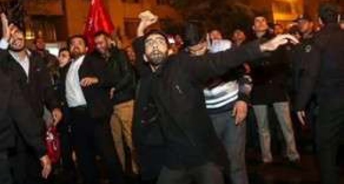 "Report"un "Hurriyet" qəzetinə istinadən verdiyi xəbərə görə, aksiya iştirakçıları Səudiyyə Ərəbistanının bayrağını yerə salaraq binanın bir hissəsini yandırıblar.