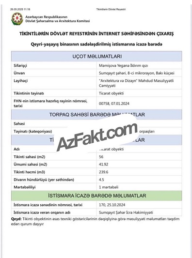 Rəsmi sənədlərdə ümumi sahəsi 56 kvm göstərilən obyektin real bazarı qiyməti 200 min manatdan artıqdır.