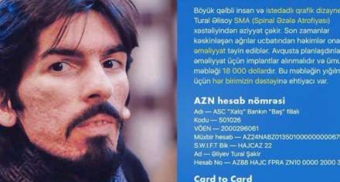 Daha əvvəllər mətbuatda və sosial şəbəkələrdə haqqında yazılan Tural Əlisoy əməliyyat olunub. O, SMA (Spinal muscular atrophy)- diaqnozu ilə yaşayır.