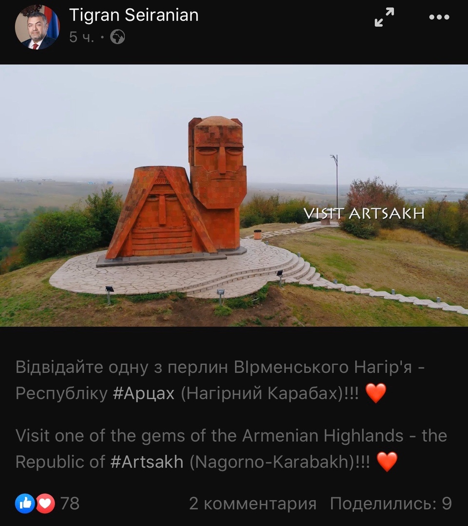 Qlobal.az modern.az-a istinadən xəbər verir ki, səfirliyin sosial şəbəkələrdəki rəsmi səhifəsində və şəxsən səfir Tiqran Seyranyanın səhifəsində Qarabağa qanunsuz səfər etməklə bağlı çağırış yer alıb. Daha geniş auditoriya əldə etmək üçün həmin elan Ukrayna və ingilis dillərində yerləşdirilib.