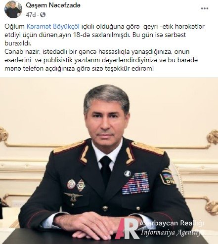 O, V.Eyvazova təşəkkürünü bildirib: "Oğlum Kəramət Böyükçöl içkili olduğuna görə qeyri -etik hərəkətlər etdiyi üçün dünən,ayın 18-də saxlanılmışdı. Bu gün isə sərbəst buraxıldı. Cənab nazir, istedadlı bir gəncə həssaslıqla yanaşdığınıza, onun əsərlərini və publisistik yazılarını dəyərləndirdiyinizə və bu barədə mənə telefon açdığınıza görə sizə təşəkkür edirəm!”.
