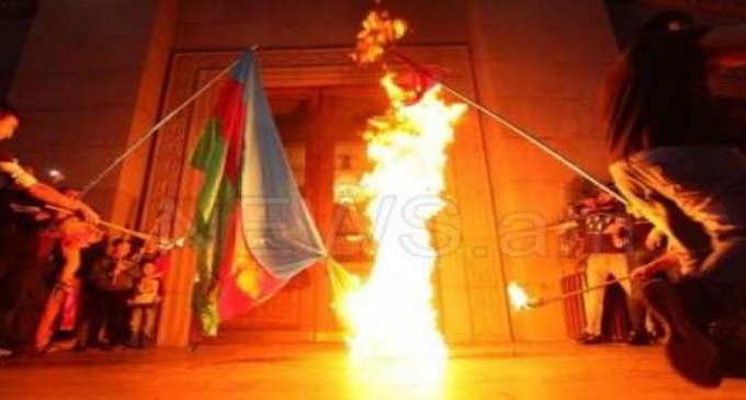 Yerevandakı Azadlıq meydanında illik məşəl yürüşünün iştirakçıları Türkiyə və Azərbaycanın bayraqlarına od vurublar.