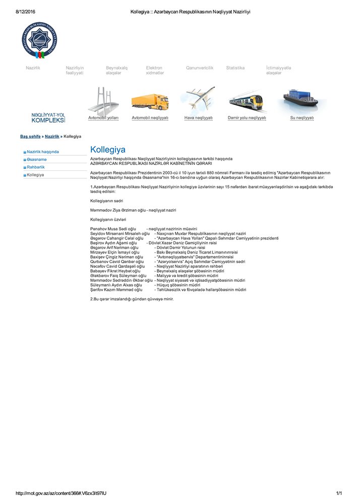 Adıçəkilən nazirliyin rəsmi saytının kollegiya bölməsində 2013-cü ildə vəzifəsindən azad olunan Aydın Bəşirov hələ də Dövlət Xəzər Dəniz Gəmiçiliyinin rəisi və kollegiya üzvü kimi göstərilir.