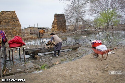 Əvvəlcə qarşımıza çıxan ilk iki daxala yaxınlaşırıq. Yağış suları palçıq və qamışdan tikilən daxalı tamamilə çökdürüb. Evin damı uçmasın deyə əlavə dirəklər vurulub. Yağan yağış nəticəsində divarlarda açılan deşiklər parça ilə tutulub.