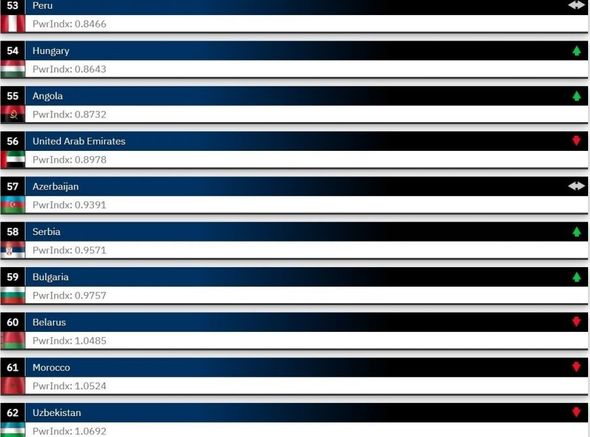 AZƏRTAC xəbər verir ki, bu barədə hərbi sahədə ixtisaslaşmış "Global Firepower” portalı məlumat yayıb.