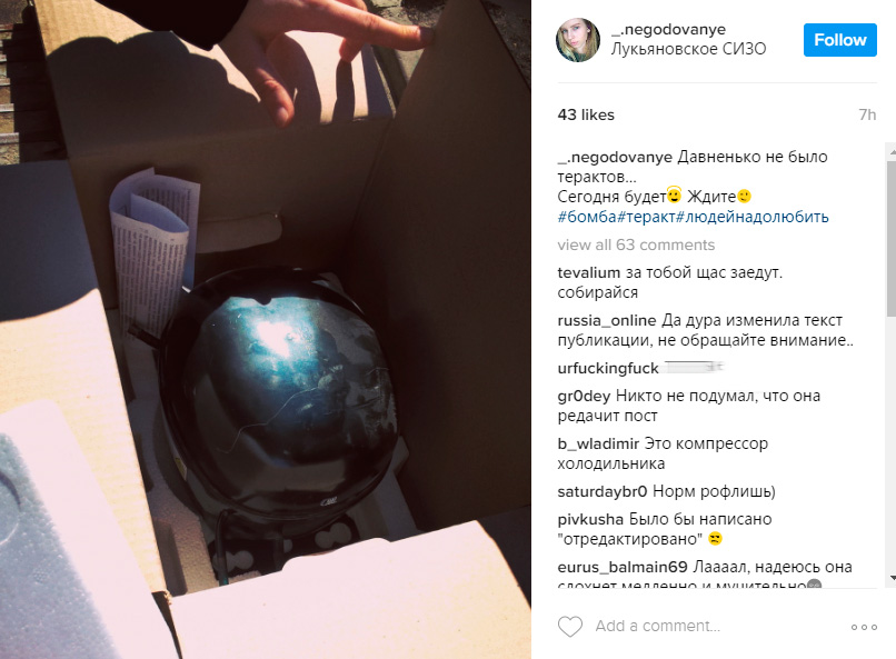 Bildirilir ki, İnstagram-ın "negodovanye" profilinin Katya Rubanova adlı istifadəçisi partlayışdan 7 saat əvvəl öz şəxsi səhifəsində "Çoxdandır terror olmur... Bu gün olacaq... Gözləyin" yazıb.