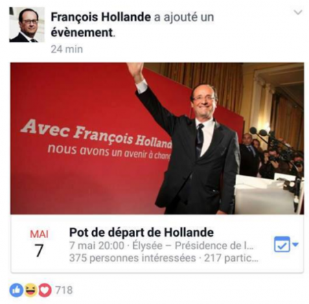 Fransa prezidenti Fransua Ollandın Facebook səhifəsi hakerlər tərəfindən ələ keçirilib. Bu barədə "BFM TV" xəbər verib. Hakerlər səhifəyə Ollandın istefa verməsi münasibətilə hamını şənliyə dəvət etməsi barədə elan yerləşdirib.