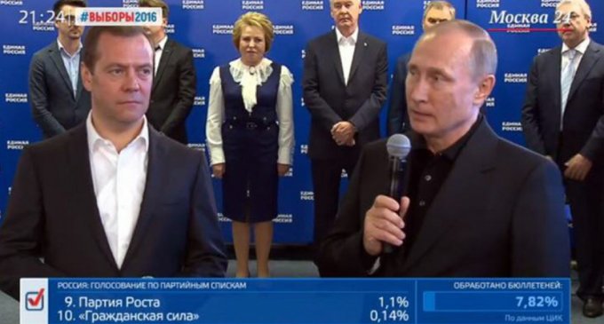 Prezident V.Putin çıxışında bildirib ki, "Yedinaya Rossiya” Partiyası çox yaxşı nəticələr nümayiş etdirib. V.Putinin sözlərinə görə, hazırda ölkədə vəziyyət çətin də olsa, insanlar "Yedinaya Rossiya” Partiyasına səs verib. O deyib: "İnsanlar siyasi sistemin sabit olmasını istəyirlər. Onlar ölkədə, siyasi sahədə, parlamentdə vəziyyətin etibarlı olmasını istəyirlər. İnsanlar görürlər ki, "Yedinaya Rossiya” Partiyasının nümayəndələri onlar üçün canla-başla çalışırlar”.
