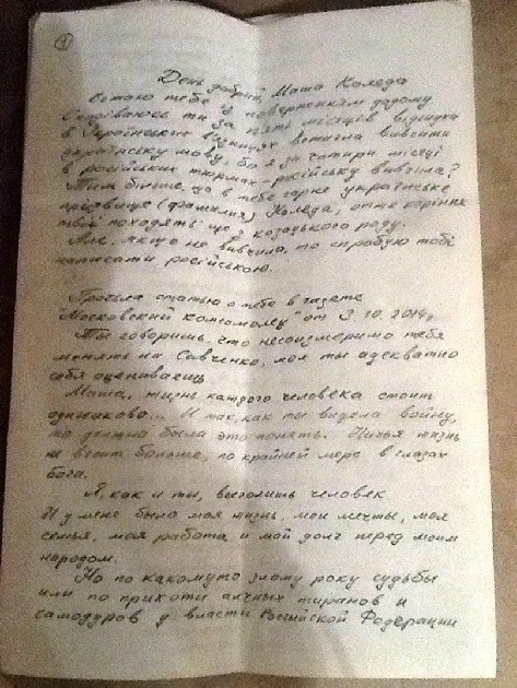 Nadejda Savçenkonun həbsdə olduğu vaxt Rusiya separatçısı Mariya Kolyadeyə yazdığı məktubu təqdim edirik: