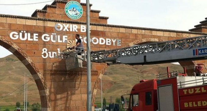 Tablo Ermənistan-Türkiyə sərhədində yerləşən şəhərin girişinə ötən il vurulub.